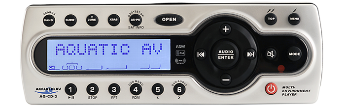 The AQ-CD-3 AM/FM/CD/XM/Sirius/iPod® is an audio and digital media center. This stereo is manufactured with XM-Ready technology. The actual XM Mini Tuner and Home Dock, made by Audiovox, are sold separately. The cartridge incorporates a Radio ID number for registration with XM Radio. Once the cartridge is activated with a subscription, the radio will receive XM and Sirius satellite signals. The Home Dock is the dock that the cartridge plugs into. The DVD-3 controls your iPod® with full navigation of all menus and is equipped with 2 auxiliary inputs for other MP3 players as well. The 4 X 50 watt amplifier delivers power to spare. The IP66 rating ensures protection against water, dust salt/fog and UV. Unlike other re-purposed car stereos that oxidize in moist environments, the AQ-CD-3 has a ZAM-coated Steel Chassis to protect from corrosion. The conformal-coated circuit boards also have silicone added in critical areas to protect them from moisture. The CD-transport mechanism meets commercial grade specifications of -20°C to 70°C. (most other third-party units only meet -10°C to 60°C degrees.) The player features an LCD Dot Matrix display with 2-stage dimmer control, RCA inputs and 4-volt outputs. This unit includes a DSP (Digital Sound Processor) as well as sub-woofer output control. The special "Two Zone" capability enables listening to two different sources in two different zones at the same time. AQ-CD-3 is equipped with two 12-volt triggers on/off and four 5-volt triggers that are momentary and the FM tuner has USA/Euro switchable frequency. The unit is available in silver and black matte finish (AQ-CD-3B).